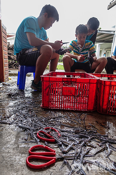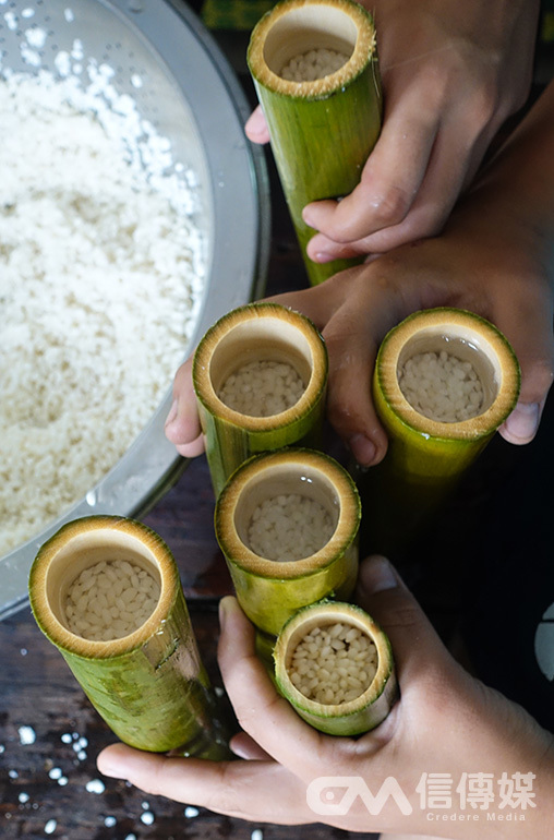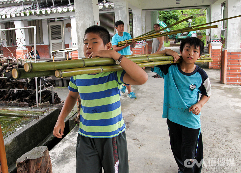 射箭隊隊員幫忙搬運竹子以製作竹筒飯。