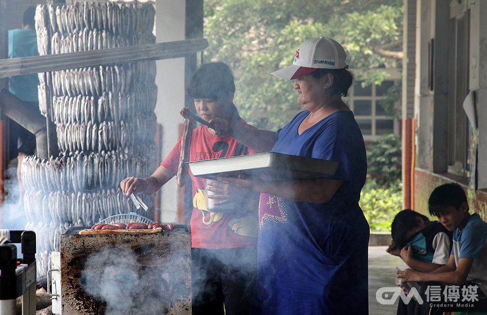 現場準備義賣烤香腸與馬告醃肉,大家都被濃煙燻到睜不開的眼睛。