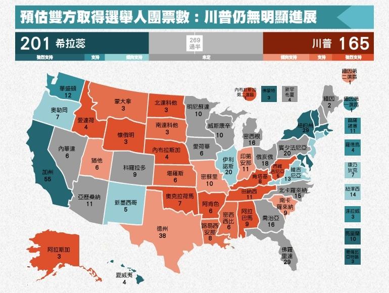 隨著美國總統大選第一場辯論會落幕,被外界視為贏家的民主黨總統候選人希拉蕊(Hilary Clinton)也跟著選情看俏,在最近完成的五家媒體民調當中,希拉蕊的平均支持率領先共和黨總統候選人川普(Donald Trump)的差距再度擴大至2個百分點以上,似乎已逐漸將先前有關健康問題與電郵門爭議所帶來的陰霾一掃而空;而在選舉人團票數的動向方面,雖然明尼蘇達州的選情再度重回膠著狀態,但希拉蕊也成功奪回東岸維吉尼亞州的優勢,使得目前希拉蕊預估可以獲得的選舉人團票數重新突破200票大關,暫時擺脫川普的糾纏。