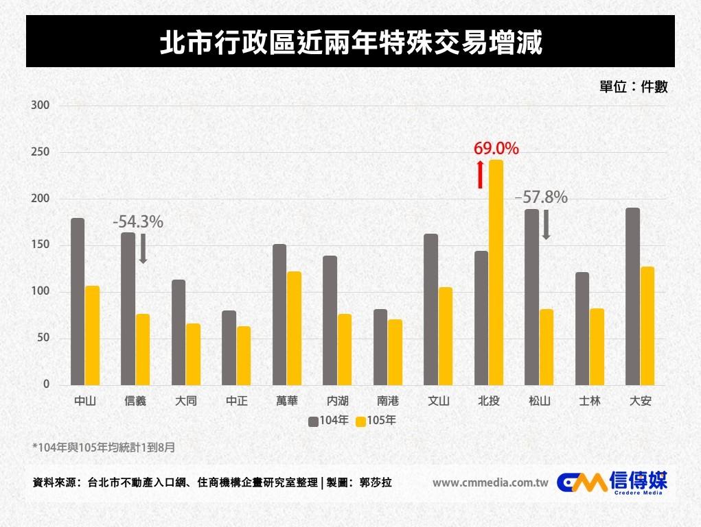 根據住商不動產統計發現,台北市的行政區中,信義與松山兩區的特殊交易量縮幅度最大,皆超過五成,反觀北投不減反增,量增69%。住商不動產企劃研究室主任徐佳馨分析,採取特殊交易者多為市價與稅基落差不小的持有人,也因此市區持有者總是更為積極,而在目前市況轉差下,還未有規劃的持有人也可能思考其他方式,讓移轉量減少,反觀較為郊區的北投反而轉為火紅,推論應和市場趨勢轉下,持有人想要提前分配有關。