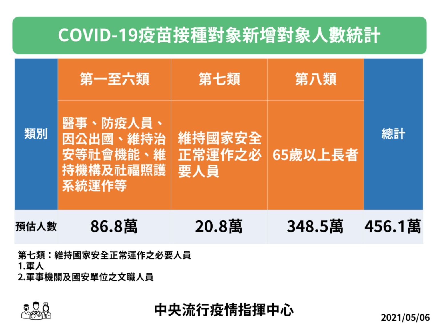 昨(5)日疫苗接種人數為5927人,累計施打人數為73988人,指揮中心將在下周一(10)日開放第七類對象(軍人、軍事機關及國安單位文職人員)以及第八類對象(65歲以上長者)接種COVID-19疫苗。