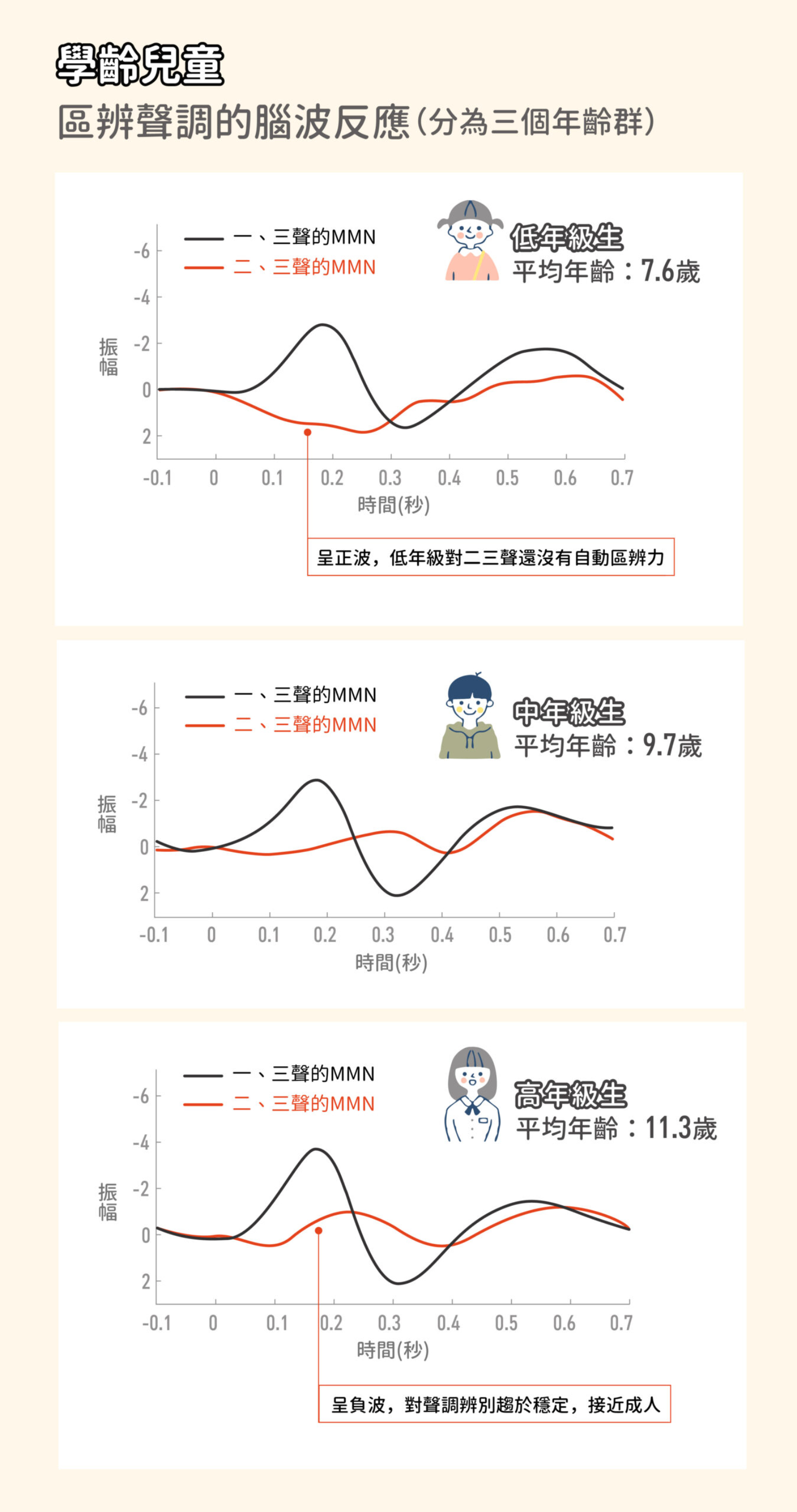 不過,對於小學一年級和二年級的孩子,一、三聲調 MMN 負向振幅很大,二、三聲調的 MMN 卻是一個正波,顯示他們對二、三聲還沒有自動區辨能力,一直要到五年級後才穩定下來。此外,識字量越高的孩子,所測得二、三聲調的 MMN 振幅越負──代表識字量越高,對聲調的敏感度越高。