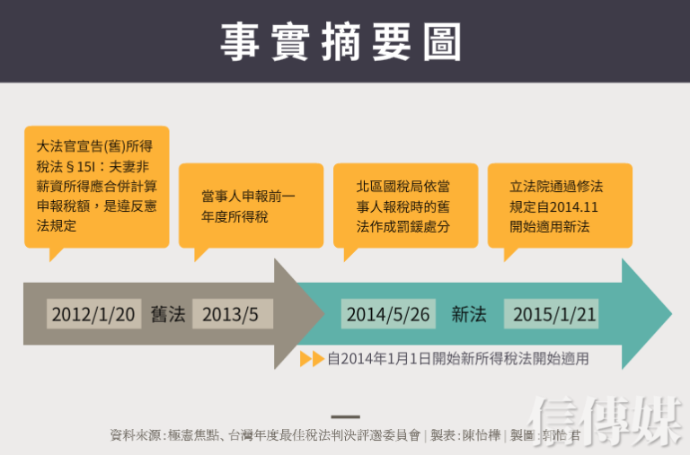 不過事實上,其實早在2012年的1月初,大法官已經宣告當時的舊所得稅法是違反憲法規定。原因是夫妻非薪資所得應合併計算申報稅額的這項規定,導致一些夫妻在繳稅時,繳的比自己單獨申報還要多,因此違反憲法的平等原則,同時並自公布後日起最遲屆滿二年時定期失效。
