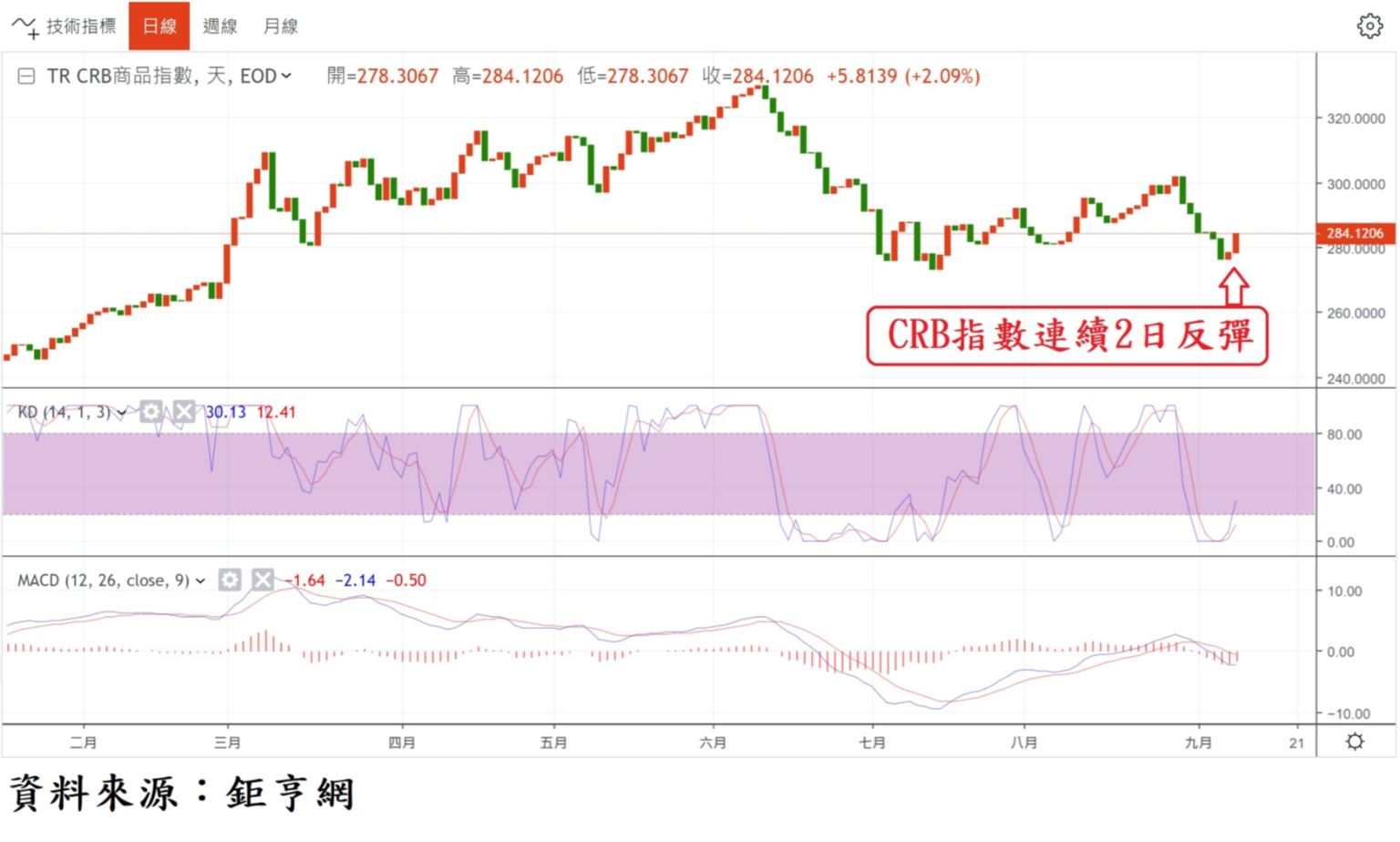 截至9月9日止,北海布蘭特原油每桶價格92.84美元,已明顯低於100美元關卡,CRB指數284.54點,自6月中旬以來的下降趨勢仍未改變,但仍在長期相對高檔區。加上美國10年期公債殖利率並未隨Fed主席鮑爾強硬的鷹派宣告,進一步突破6月中旬的年初來最高點3.5%,顯示全球總體經濟總額需求持續轉弱之中,代表全球經濟景氣將持續下行。