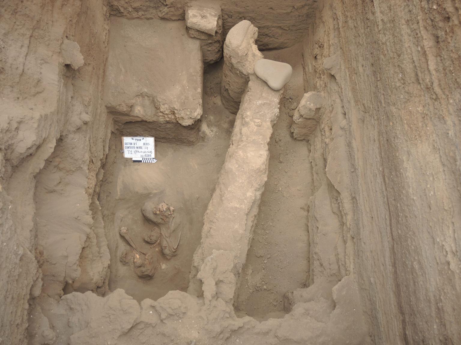 當遺址進入第三階段(距今 4,100 至 3,650 年前),居民生活似乎有了顯著的轉變。首先,以泥磚(adobe)興建的大型公共建築開始出現。考古團隊在其中一處泥磚牆下發現一具女性骨骸。從地層上可以看出,放入骨骸之後,人們在她身上放置一塊石頭,並有燒火的火煻痕跡,之後緊接著進行泥磚牆的建築作業。由此推測,骨骸放置與相關活動可能和施工前的儀式有關,這些特殊活動也讓學者更相信,此處發現的建築牆基是屬於公共建築,而非一般的家庭住屋。