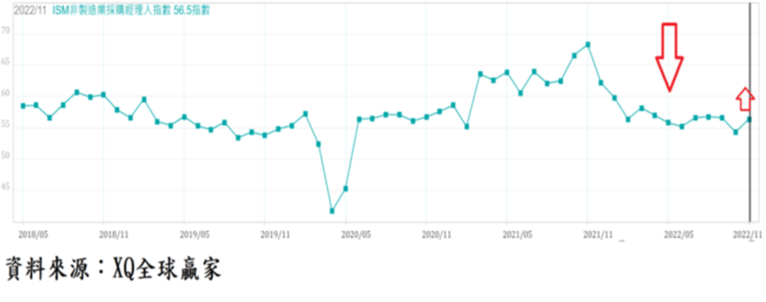 美國非製造業採購經理人指數(ISM)11月自10月的54.4、2020年5月以後最低點,反彈至56.5,遠高於市場預期的53.1,但經濟景氣自2021年底以來出現降溫的趨勢並未因單月反彈而改變,雖連續第30月高於代表景氣擴張臨界點50,顯示整體GDP比重超過八成的服務業,仍在擴張軌道。
