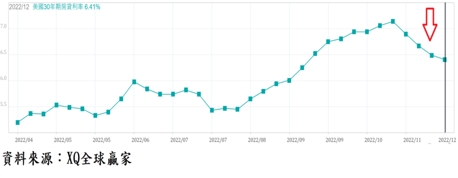 美國30年期房貸利率隨美國聯準會貨幣政策由寬鬆轉向緊縮而快速走高。美國30年期房貸利率由2021年底的3.33%,11月最高攀抵7.14%,續創金融海嘯後的最高檔,隨著美國10年期公債殖利率自10月21日的今年高點4.3354%開始轉向回檔,於12月8日創3.4006%,為9月15日以來最低點,美國30年期房貸利率自11月上旬高檔7.14%,連續4周下降,至12月上旬回落至6.41%,但仍在長期相對高檔區。