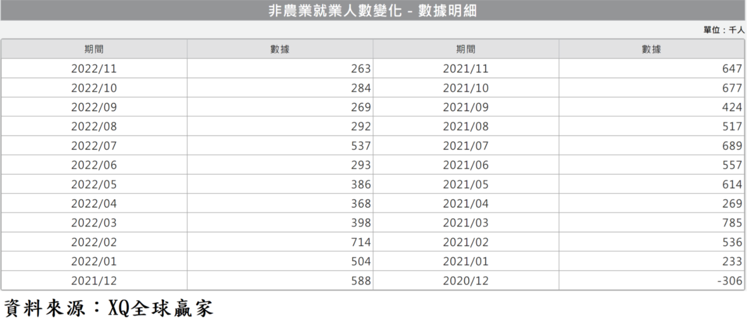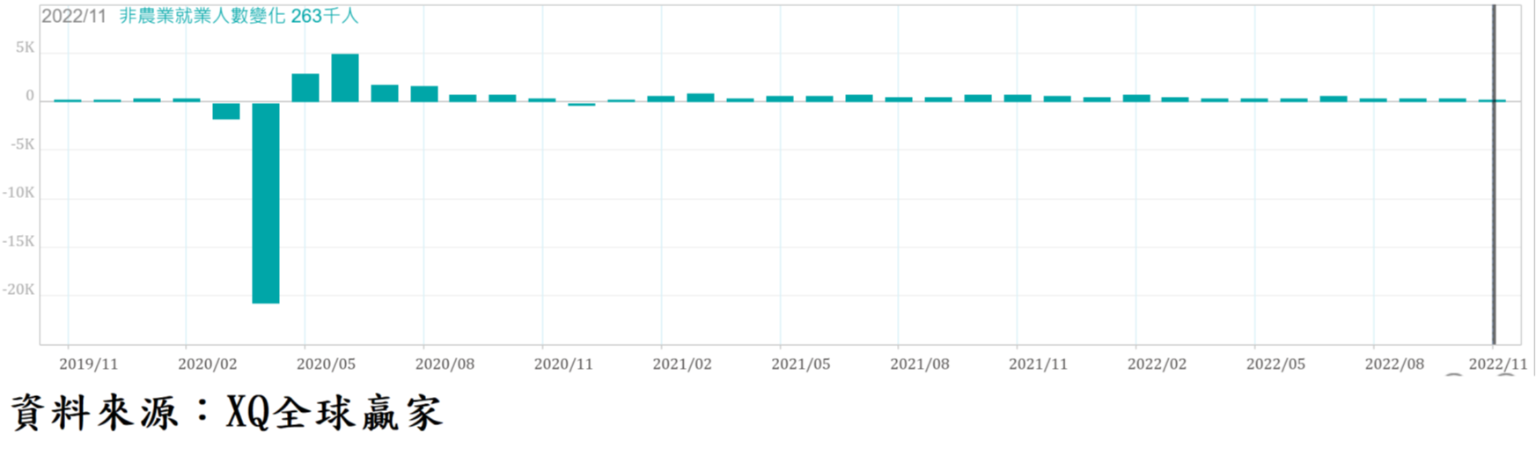 美國11月非農就業人數增加26.3萬人,雖自7月的53.7萬快速下降,亦低於10月的28.4萬人,但仍稍優於市場預期的20萬人。11月非農業新增就業人口仍高於長期平均數20萬人,顯示美國非農業就業市場維持穩定狀態。11月失業率持平在3.7%,連續2個月維持在3.7%,脫離近50年低點3.5%。自2020年5月至2022年11月的31個月新增非農業就業人口合計為2,318.6萬人,為2020年3月、4月的減少人數合計數2265.6萬人的102.34%,已超過疫情爆發前的就業水準。