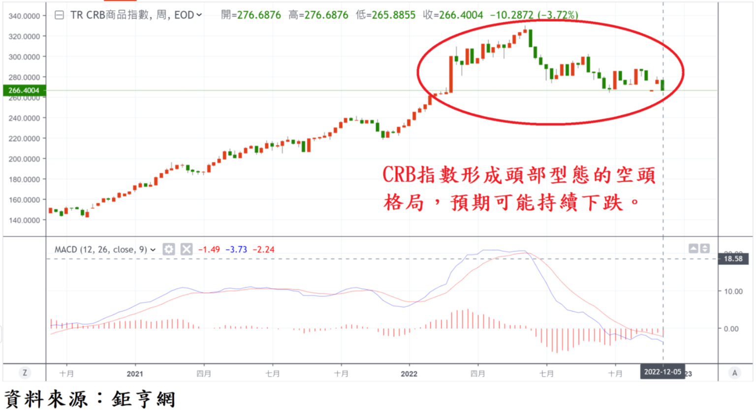 但在全球總體經濟持續下行,大宗商品原物料CRB指數走勢已出現做頭的下降趨勢,美國聯準會可能在2023年第二季隨經濟景氣持續轉弱,進入貨幣緊縮政策後期的升息觀望期,長年期公債殖利率隨經濟景氣進入衰退階段,將呈現攀高無力,殖利率可能持續下降。
