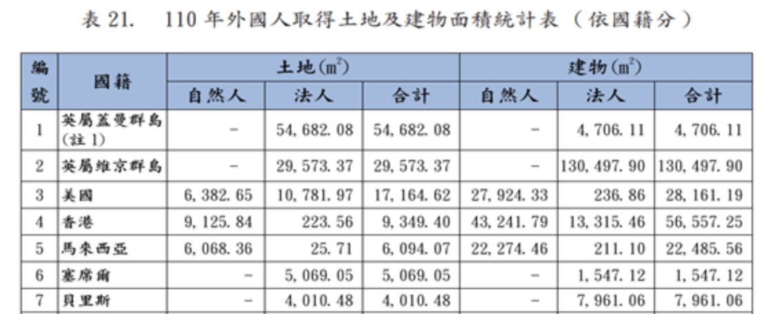 根據地政司資料統計,去年外國人購置不動產中,建物部分買最大的就是英屬維京群島,雖然不見得全部都是購置住宅,但豪宅市場登記在這類公司情況的確相當常見,光2021年英屬維京群島就買了3.95萬坪,還有登記在公司名下狀況也當普遍。