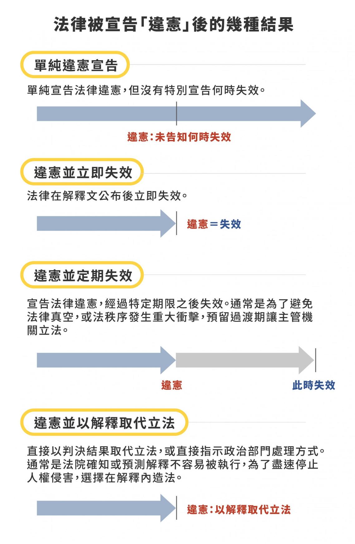 儘管修法確實需要時間和心力,但從林建志分析的諸多案例可觀察到,同為違憲宣告,比起「違憲並立即失效」、「違憲並定期失效」、「違憲並以解釋取代立法」,單純違憲宣告不會使權責機關面臨法律真空的壓力,容易導致大法官解釋被消極對待。