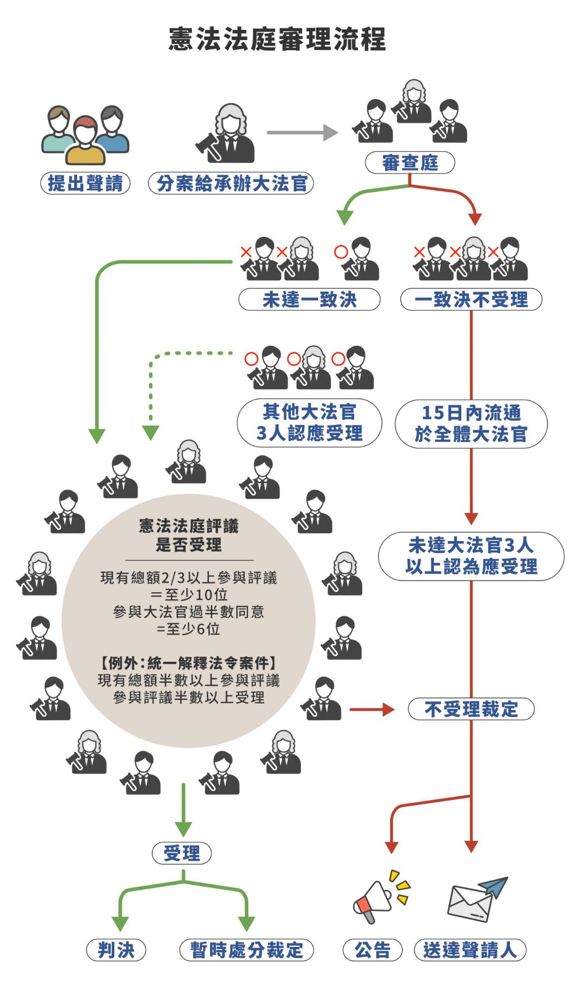 首先,聲請案件會用電腦系統隨機分給一位承辦大法官,他必須研判是否受理、提出審查報告,並送所屬審查庭的其他大法官表示意見。審查庭由 3 位大法官組成,如果一致決裁定不受理,案件就不會進入後續程序(特殊情況參見下方流程)。