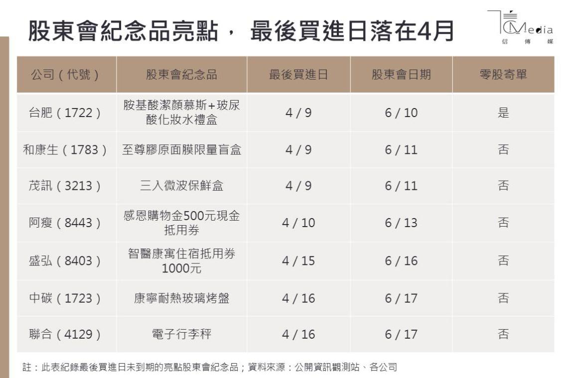 若進一步統計,股東會紀念品最後買進日落在4月的公司,其中包括台肥(1722)送出「胺基酸深層潔顏慕斯+玻尿酸保濕潤澤化妝水禮盒」,最後買進日落在4月9日;和康生(1783)則推出「至尊膠原面膜限量盲盒」,最後買進日也落在4月9日。