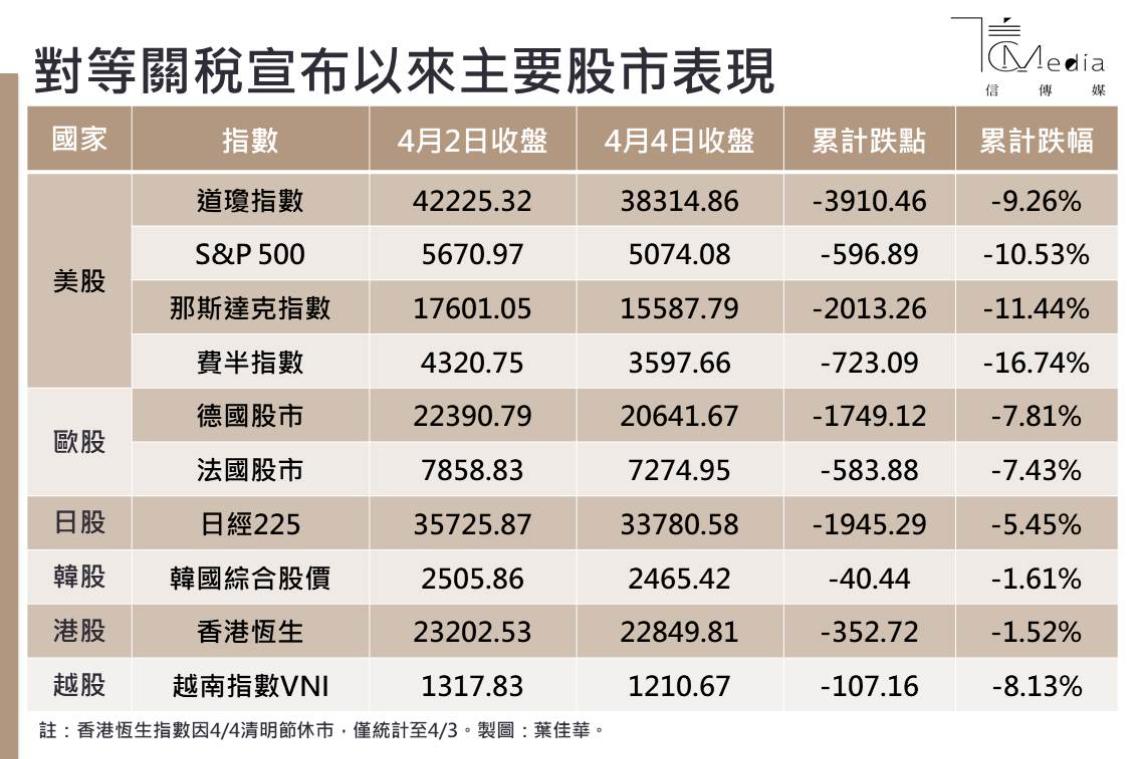 不僅美股,作為歐股指標的德國及法國股市這兩天也同步重挫超過7%,亞股部分,其中又以日股及越股為震央,日股連崩兩天累計跌點1945點、跌幅超過5%;而一開始被宣布課徵46%對等關稅的越南,股市也受到大震撼,越股兩天暴跌超過8%。
