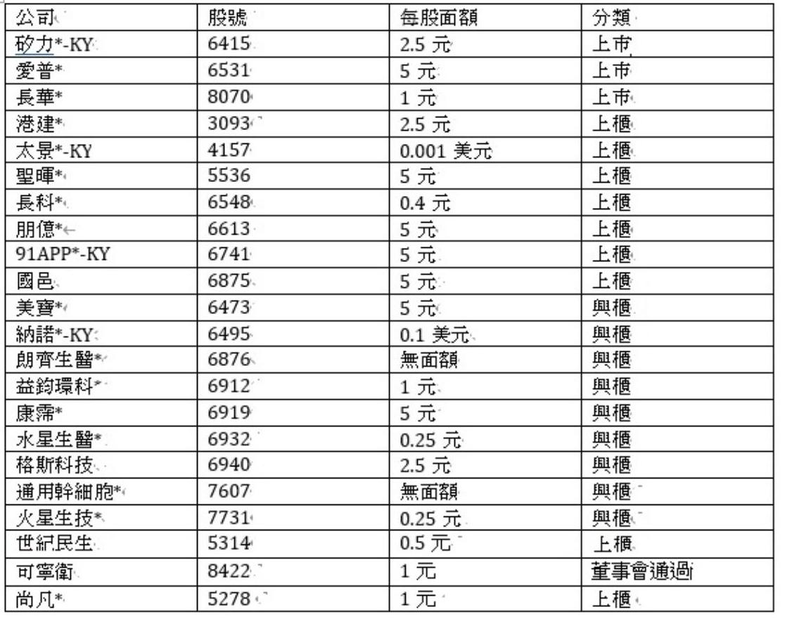 過去幾年,國內至少有22家上市櫃、興櫃公司進行股票分拆,分拆後在證交所的名稱後面都會多一個「*」以做判別。例如長華*、港建*、太景*-KY、聖暉*、長科*、朋億* 、91APP*-KY 、國邑、美寶*、納諾*-KY、朗齊生醫*、益鈞環科*、康霈*、水星生醫*等。