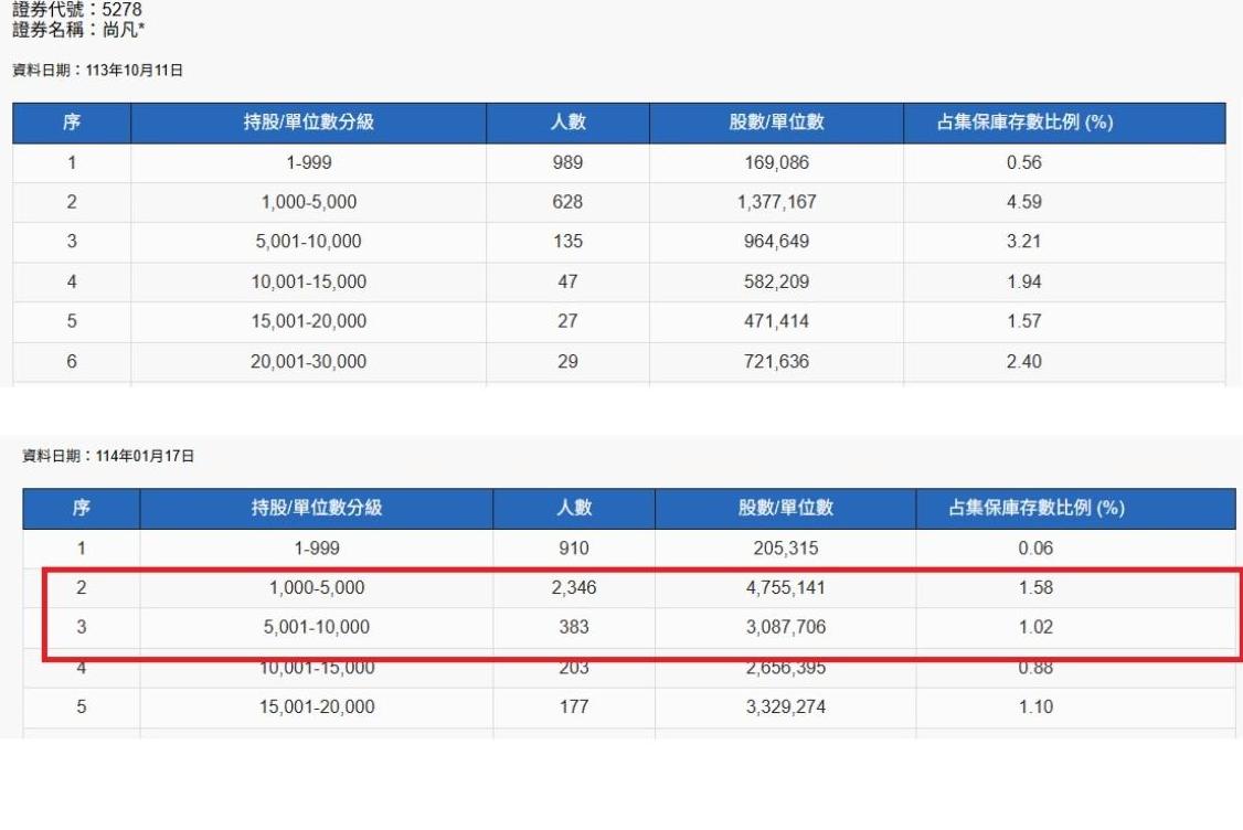 尚凡的散戶、持股較低部位的投資人數,很明顯的增加,分拆之前買1到5張(最多5千股)的人數約6百多人,分割後爆增為2346人,但其實加起來的持股成本是接近的。