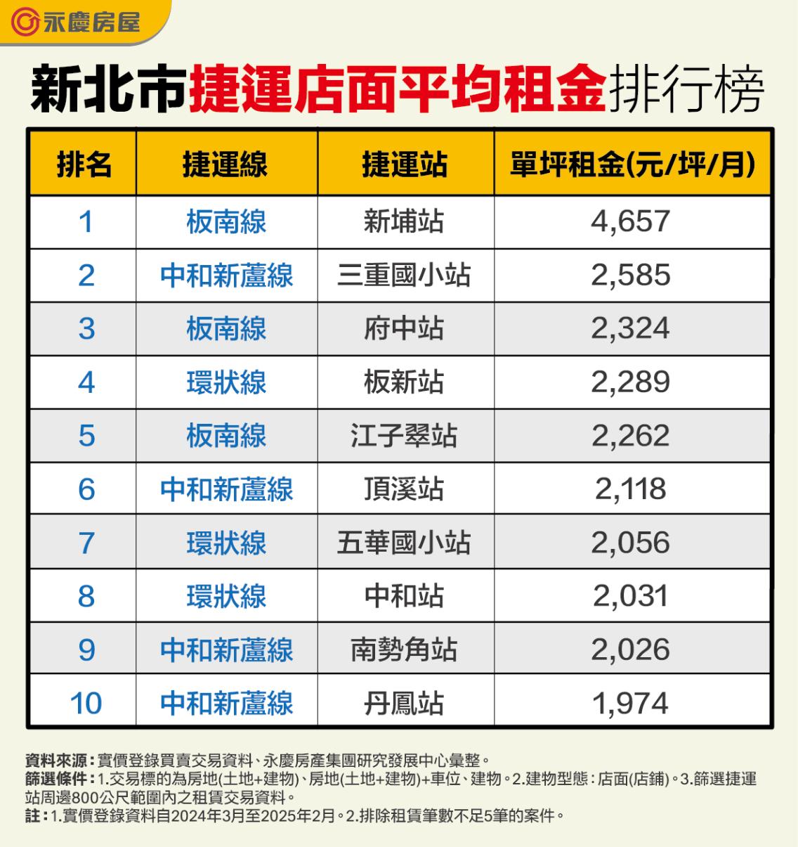 捷運已成為雙北地區民眾最仰賴的大眾運輸系統,根據台北捷運公司統計,台北捷運旅運量於今年3月突破140億人次,大量的通勤人潮也為捷運站周邊帶來龐大商機。永慶房產集團根據近一年實價登錄租賃資料,統計出新北市十大店租最貴的捷運站。其中,「新埔站」店面以平均單坪租金4,657元居冠,其次則是「三重國小站」與「府中站」位居二、三名,且前十名捷運站點中有4站都在中和新蘆線上,消費力最強!