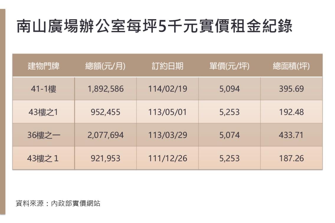此次最新單坪五千元辦公室的實價揭露,是「南山廣場」的41-1樓,395.69坪,月租189.2萬元,訂約日期是在今年的2月份,單坪租金5094元,是該辦公大樓第四次出現每坪5千元的實登價格。