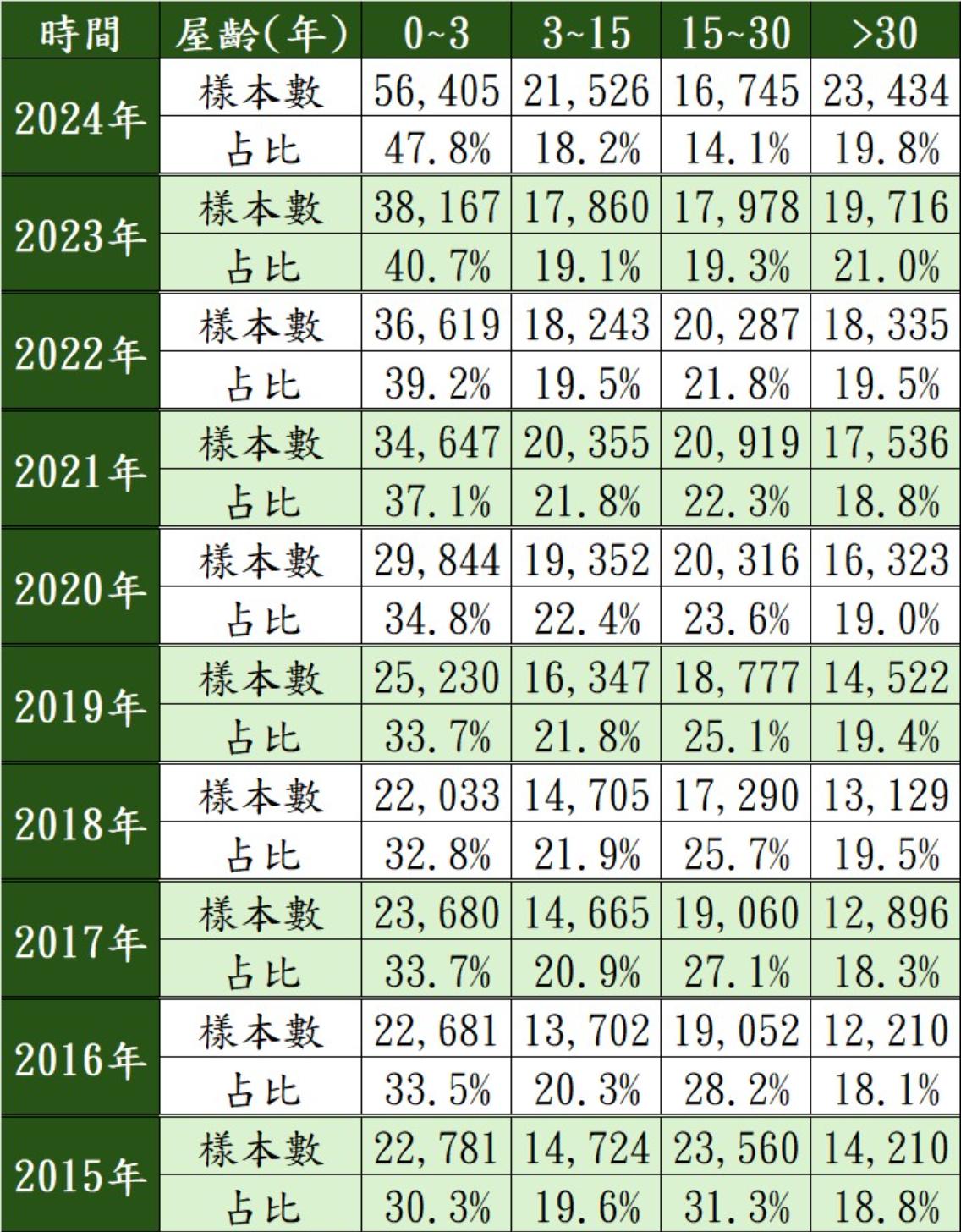 觀察聯徵中心數據,2015年20~40歲購屋人所申貸的房貸案件中,屋齡15~30年的物件占比達31.3%最高,屋齡0~3年者占30.3%次之;不過等到10年過後,2024年20~40歲購屋人所申貸的房貸案件中,有5萬6,405件是屋齡0~3年的新屋,占比高達47.8%,此數據不論是樣本數與占比,皆是10年以來最高。
