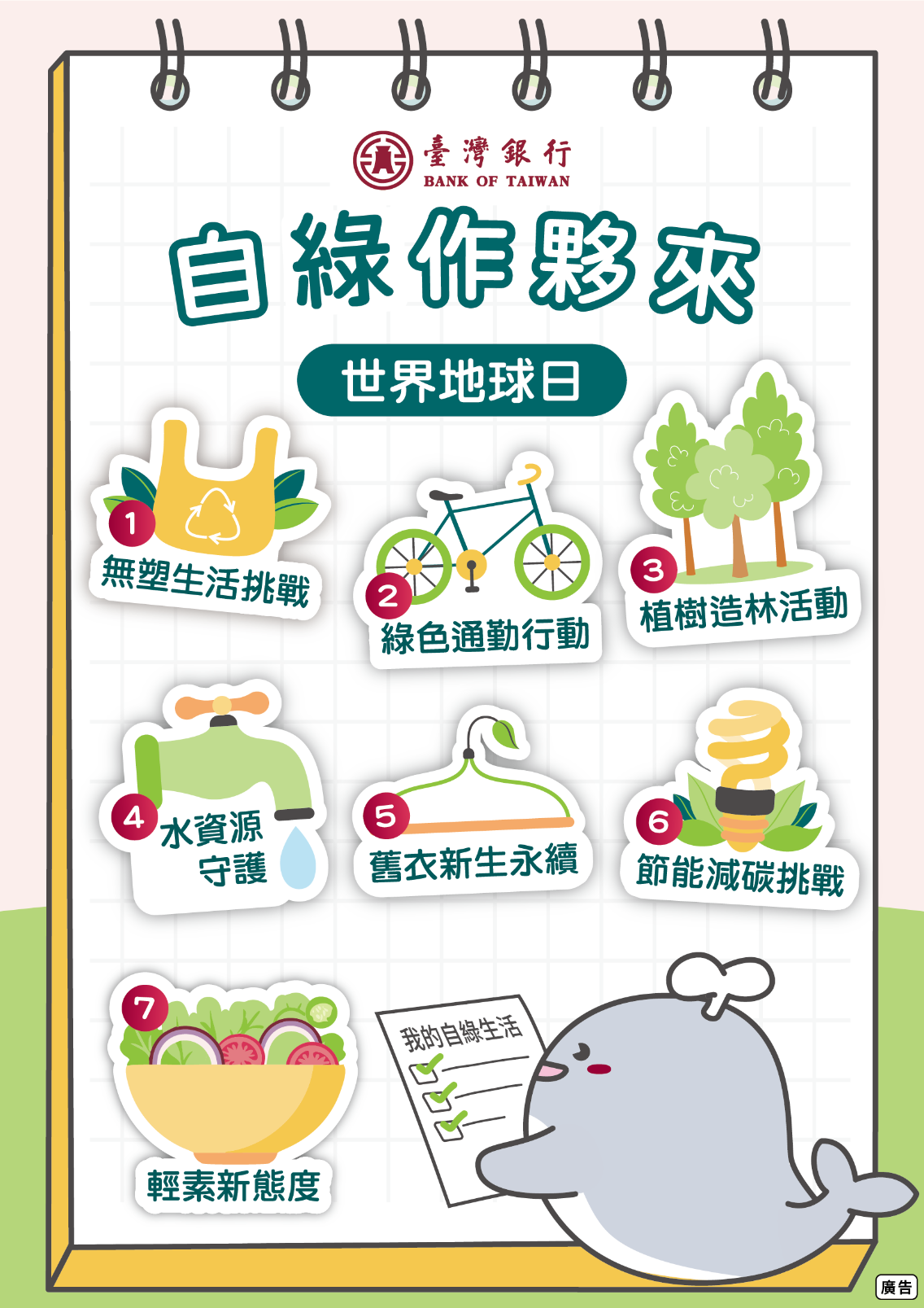 面對氣候變遷與永續發展挑戰,臺灣銀行積極響應全球環保倡議「地球一小時」及「世界地球日」,舉辦「你倡議,我種樹」、「自綠作夥來」等活動,邀請全體同仁及來行客戶共同參與,攜手關注氣候變遷議題,展現金融業對於環境保護的認同與落實永續發展的責任。