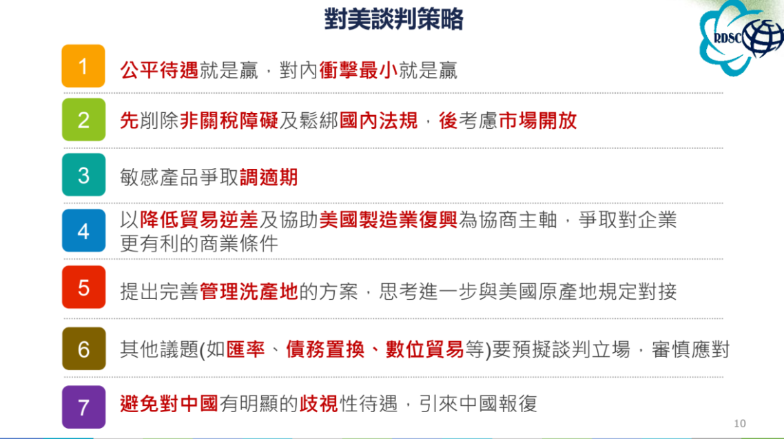 至於台灣的談判策略為何?根據楊書菲說法,主要有7點,其中包含「公平待遇就是贏」,不要對擴免心存幻想,力求跟其他國家相同關稅、有公平待遇,讓對內衝擊降到最小。