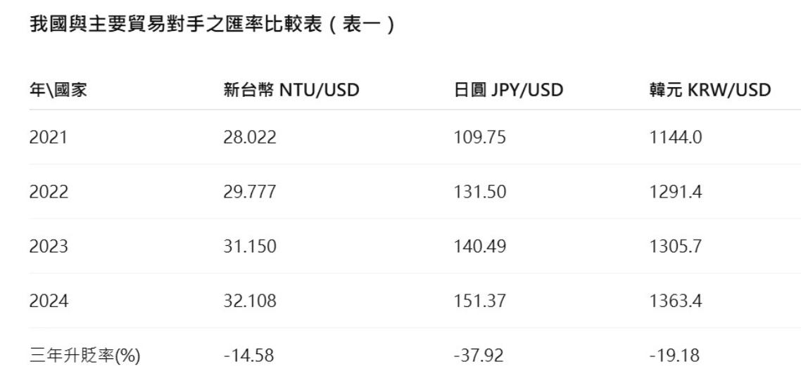 以過去三年(2022~2024)的匯率比較來看(如表一),台日韓三國對美元分別貶值了14.58%(台)、37.92%(日)、19.18%(韓),其中台幣貶值是最少的,也就是台幣對於日幣和韓元是升值的。因此說台幣低估創造出口是毫無根據的。