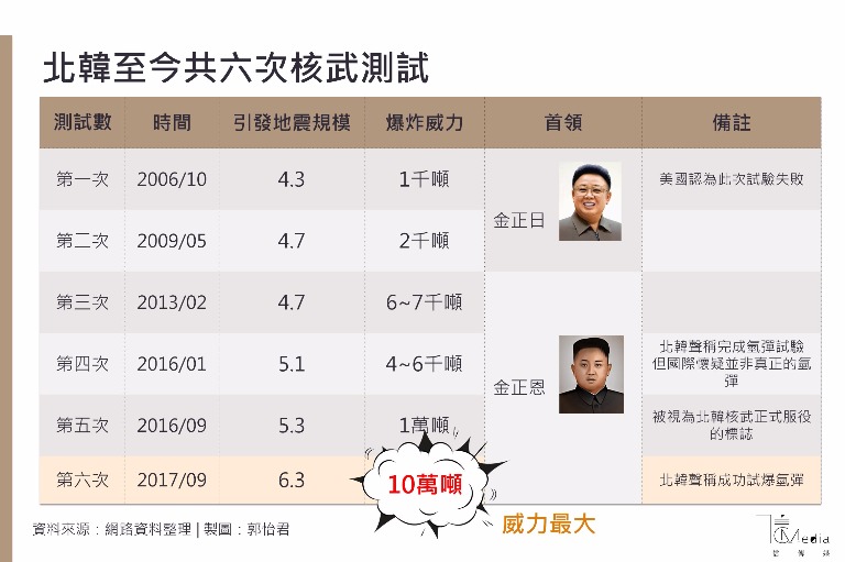 根據北韓中央通信社報導,北韓於昨(3)日氫彈試爆成功,且「核彈頭運作的有效性獲得充分保證」,這除了是北韓第六次的試射,同時也是有史以來威力最強大的核武試爆,蔡英文總統還特別為此召開國安會議,一般預料,此舉絕對會使朝鮮半島的緊張情勢更為險峻,也將牽動整個中日美韓多方在東北亞局勢的角力。