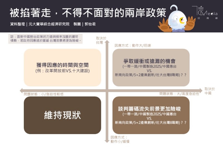 其中,一大顯而易見的危機在於兩岸經濟政策。梁國源表示,雖然多數人對此感到反感,但不可否認中國大陸依舊是台灣最大的經濟貿易夥伴,蔡政府刻意避談兩岸關係,對於台灣經濟榮枯存在重大影響的事實,更重要的是,台灣、美國、中國大陸間的三角「平衡」關係已經改變。
