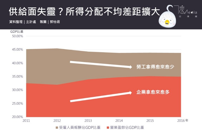 即使日前公布的3月失業率3.66%,創下18年以來同月新低,但低薪問題仍然存在,從GDP呈現出的所得分配更可以看到,截至2016年底為止,17.1兆元的GDP,7.5兆元分配到受僱人員的報酬,占GDP比率43.81%,創下歷年次低,至於分配給企業盈餘的占比則達到35%,有逐年增加的趨勢。