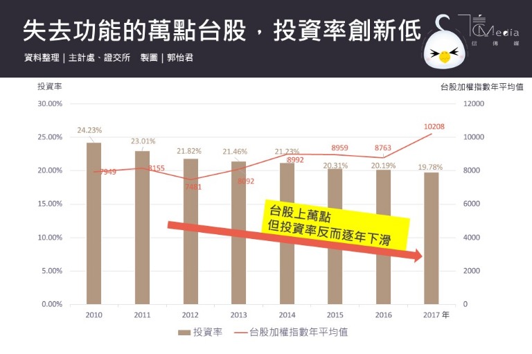 只是奇怪的是,格外搶眼的台股另一面卻成為資本市場中介角色失能的印證,截至去年為止,國內投資率跌破20%到19.78%,創下8年來的最低紀錄。梁國源直言,一般來說,股價愈高代表企業的籌資能力愈高,企業籌資之後理當看到更多的投資活動。「但現在卻沒看到,也就是資本市場帶動實體經濟的功能失靈。」