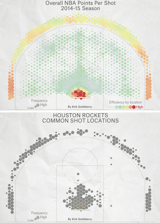 而且莫雷藉由球場上各個位置出手的命中率分析指出,長距離的兩分投籃每次嘗試的平均得分較低,因此如果要拿兩分球,那就在禁區內的取分率較高,因此,這個賽季火箭隊在禁區內投籃命中率為82%,禁區內命中率第二高的隊伍只有71%。