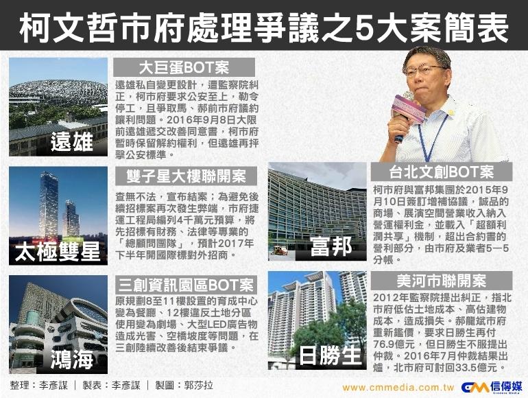 「不平等條約」、「喪權辱國」是5大案的普遍情形,柯文哲除弊打貪本應受到褒揚,但是解決了4大案卻悄無聲息,一上任意氣風發的柯P,坦言花太多力氣處理以前造成的困難,或許,柯市府把5大案想得太簡單,畢竟他面對的財團都非等閒之輩。