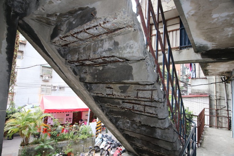 尚未整合成功的60戶住戶,其主要出入的樓梯都已鋼筋外露,險象環生。(攝影/王明鈞
