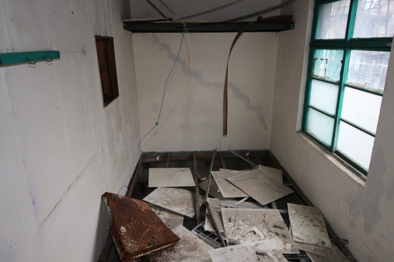 無人居住的房舍,天花板也因年久失修而掉落在地板上。(攝影/王明鈞)