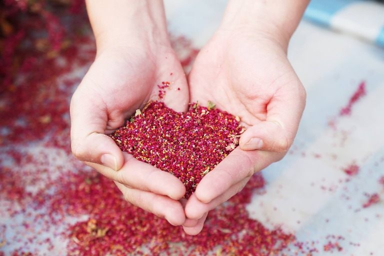 「所以我們大多會要求農民做初篩,初步將大的葉子、枝條篩掉,也會到現場教農民,怎麼曬紅藜才不會讓小石頭等雜質跑進去,在契作說明會上我們還會帶樣品讓農民摸看看,日曬後的紅藜乾燥度要多少才是合格等等,這些溝通很重要,都是為了確保農民有能力交貨。」謝振昌說。