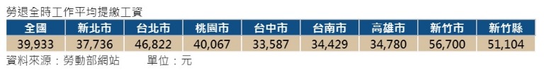 根據勞動部最新統計,台北市的勞退全時工作平均提繳工資為4萬6822元,冠絕六都,不過,卻非全國之最,因為新竹縣、新竹市的平均提繳工資全都超過5萬元,在房價只有台北市三分之一的情況下,房市支撐相對穩定。