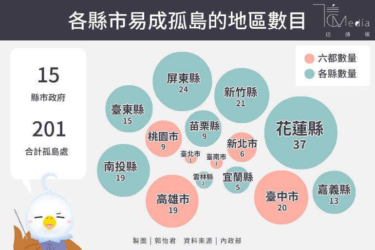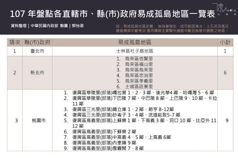 根據內政部消防署綜合整理交通部、原民會、農委會、經濟部及各縣市政府資料,盤點出全國共有15縣市201處易成孤島地區,也就是曾經發生或可能因淹水、土石流及風災、道路橋梁中斷等災害,而導致主要聯外道路中斷且無替代道路之地區。區內約有36380戶,98614位居民。