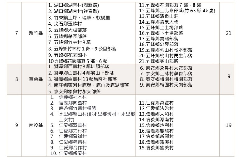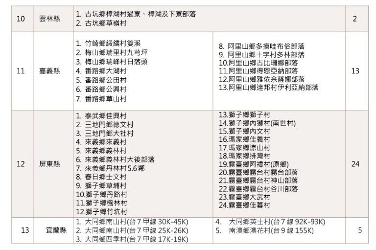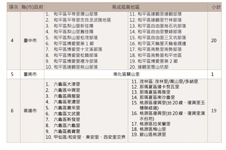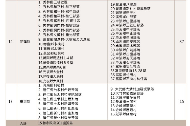 這201處,首都台北就有社子島,新北主要是烏來,桃園是復興鄉,台中和平,台南南化,高雄六龜、那瑪夏、桃源,新竹縣五峰,苗栗泰安,南投仁愛、信義鄉,嘉義阿里山,屏東來義、霧台、獅子鄉,宜蘭大同,花蓮秀林、壽豐,台東達仁、金峰鄉等。其中更以花蓮37處,屏東24處較多。