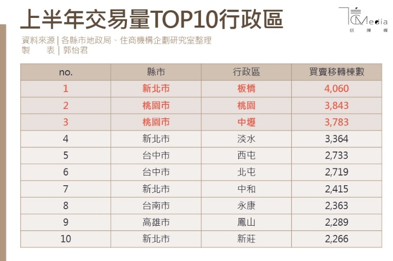 根據六都地政局資料,住商機構企劃研究室統計出上半年交易量最多的前十大行政區,其中,新北市板橋區爆冷奪魁,上半年累計買賣移轉棟數4千棟,榜眼、探花都在桃園市,分別是桃園區及中壢區;上半年的黑馬是台南市永康區,以2363棟登上第八,相較之下,過去一直是話題焦點的台北市,並未有任何行政區進榜。