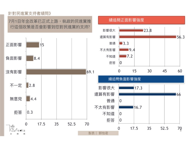 根據《信傳媒》所做的台北市最新民調顯示,政黨傾向支持民進黨的選民,認為7月1日已經上路的年金改革,有69.1%的人覺得並沒有影響到對民進黨的支持,而有15.0%的人覺得有正面影響,僅有8.4%的人覺得有負面影響,此結果顯示年金改革對民進黨支持者的衝擊不大,甚至無動於衷的人最多。