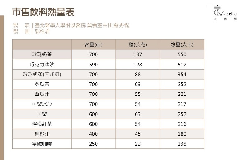 一般加糖罐裝飲料500cc,約有50-55公克糖;市售飲料700cc,約有60-80公克糖;糖度最高的奶茶700cc,則糖量更高到90-115公克;加糖的咖啡飲料,也有30-40公克糖。