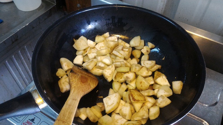 4-將茄子盛出後,用鍋中油繼續炒香豆瓣醬與蝦米。