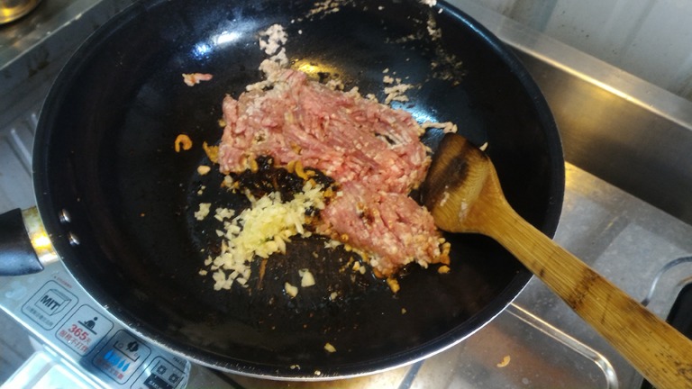 5-絞肉與蒜末下鍋與豆瓣醬蝦米炒香,加入砂糖炒亮
