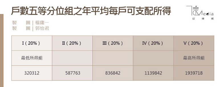 再看看每戶的工作人口。用常識判斷,即不難知道工作人口數與家庭的總收入,應呈現明顯的正相關。台灣雖然每戶平均有1.45個工作人口,但,五級組家庭的工作人口,卻分別為0.47:1.05:1.51:1.90:2.31。換句話説,約20%(I級組)加上近20%(II級組)的家庭,是靠單人或單親努力在支撐。因此,我推估台灣至少可能有20%-30%的家庭,正在陷入「看不見」的貧窮,應該不致脱離現實太遠吧。