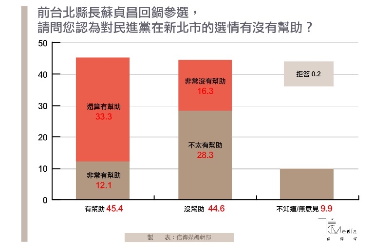 13年來,新北市在國民黨周錫瑋與朱立倫的執政下,基本盤還是藍大於綠,綠營始終是在後追趕的狀態。這次蘇貞昌再次下海,遇到的第一道關卡就是被批評為「老人回鍋」,產生負面觀感。最新民調顯示,關於「前台北縣長蘇貞昌回鍋參選,請問您認為對民進黨在新北市的選情有沒有幫助?」有45.4%的選民認為對民進黨有幫助,但也有44.6%認為沒幫助,兩者比例相當,可見不論是由吳秉叡還是蘇貞昌出戰,都難以改變綠營在新北市本就難攻的事實,畢竟蘇貞昌「沒有經營」新北市有一段時日了。