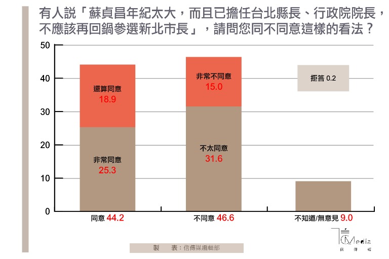 事實上,民進黨徵召蘇貞昌時,就有選民質疑:「難道民進黨是沒有人了嗎?」民調顯示,有44.2%的選民同意「蘇貞昌年紀太大,而且已擔任台北縣長、行政院院長,不應該再回鍋參選新北市長」,但也有46.6%的選民仍認為蘇貞昌有資格參選,特別是50歲以下的中壯世代選民比較支持,這是蘇貞昌可以善加經營的族群。只是,整體而言,正反比例差不多,顯示蘇貞昌豐富的從政經歷不是最大優勢,而年齡大的弱勢要解除恐要費一番手腳。