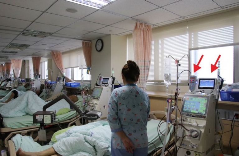 再者,則是在病人透析的4小時過程中,醫護人員可以一目了然地察看病人的血壓、血液透析紀錄、耗材、醫囑、藥囑等記錄,並掌握透析過程,「以前護理師每一小時就要幫病人量一次血壓,現在系統會即時呈現病人血壓狀況,也能減輕護理師人力及工作量;或是像主治醫師在別的樓層巡房,不用跑上跑下就能立即關注各床病患的最新狀況。」馬堅毅描述。