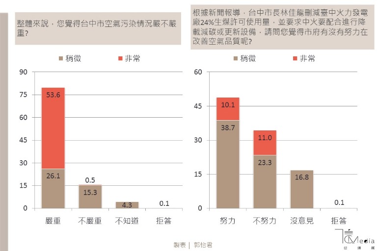 而雖然台中選民也有高達79.7%的比例,十分一致認為空污問題算是嚴重,但當問到林刪減台中火力發電廠生煤許可使用量,並要求中火配合進行降載減碳或更新設備,也有48.8%的選民覺得市府有努力在改善空氣品質,且其中也有很大比例的國民黨支持者。