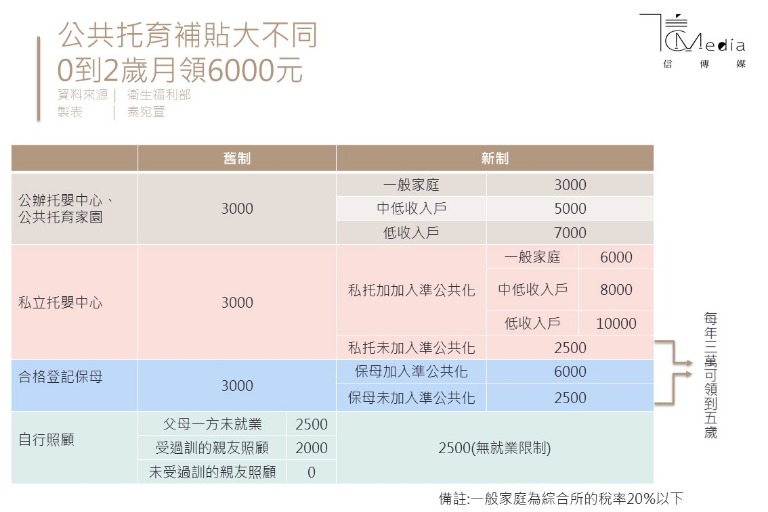 衛福部將和各地方政府共同訂定托育費用收費價格,進行價格管理,把托育費用支出控制在家庭可支配所得的10-15%間,依照公托、私托、保母以及自行照顧給予2,500元至1萬元不等的托育費用來實質減輕育兒家庭負擔,且0至2歲,或限制父母一方未就業,從0至未滿5歲,銜接5歲免學費,每月2,500元。