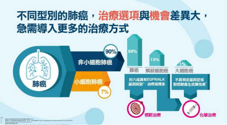 目前非小細胞肺癌佔國內肺癌約9成患者,其餘為小細胞肺癌,而非小細胞肺癌又可分為腺癌、大細胞癌與鱗狀細胞癌,針對不同基因型態,已有許多治療武器可選擇。